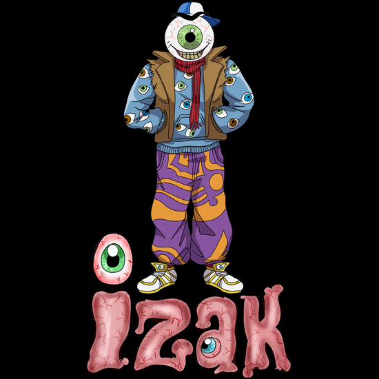 Izak's head is comprised of a strikingly large eyeball, which can elicit a mix of fascination and unease from those who encounter him. Positioned above this eye is a prominent, bushy unibrow that contributes to his unique appearance. Izak often dons a hat, which varies from a sophisticated fedora to a casual beanie, depending on his current disposition.