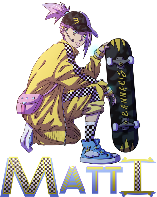 Matti is a very intelligent girl, and she loves to skateboard, but she was not satisfied with the world she lives in, because she was tired of always seeing the same streets and places. So she created a special vehicle so she could go to other places, but not just any place... To other dimensions. She also created a special headset to be able to communicate with other species. Now it is her skateboard that allows her to travel between the different dimensions, and thus get to know incredible places, cultures, languages, people, etc.